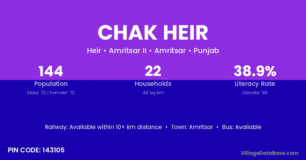 Chak Heir village has a total population of 144 people, of which 72 are males and 72 are females.