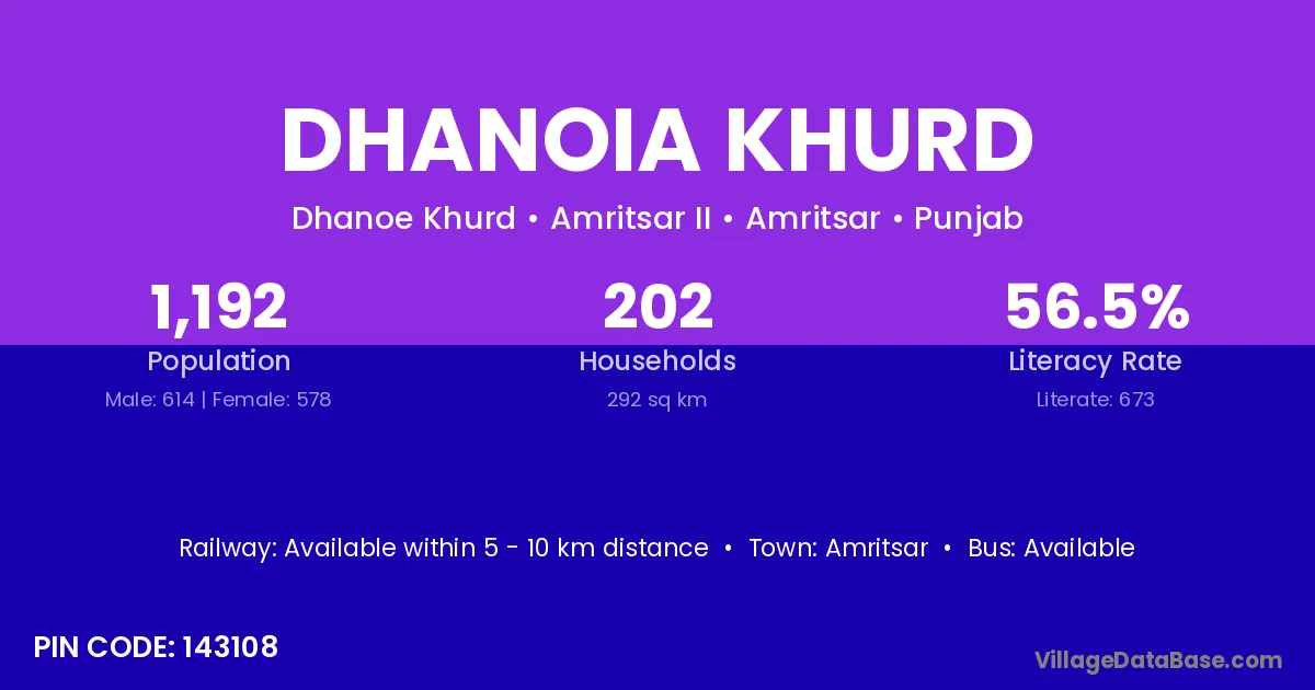According to Census 2011 information, the village code of Dhanoia Khurd village is 143108.