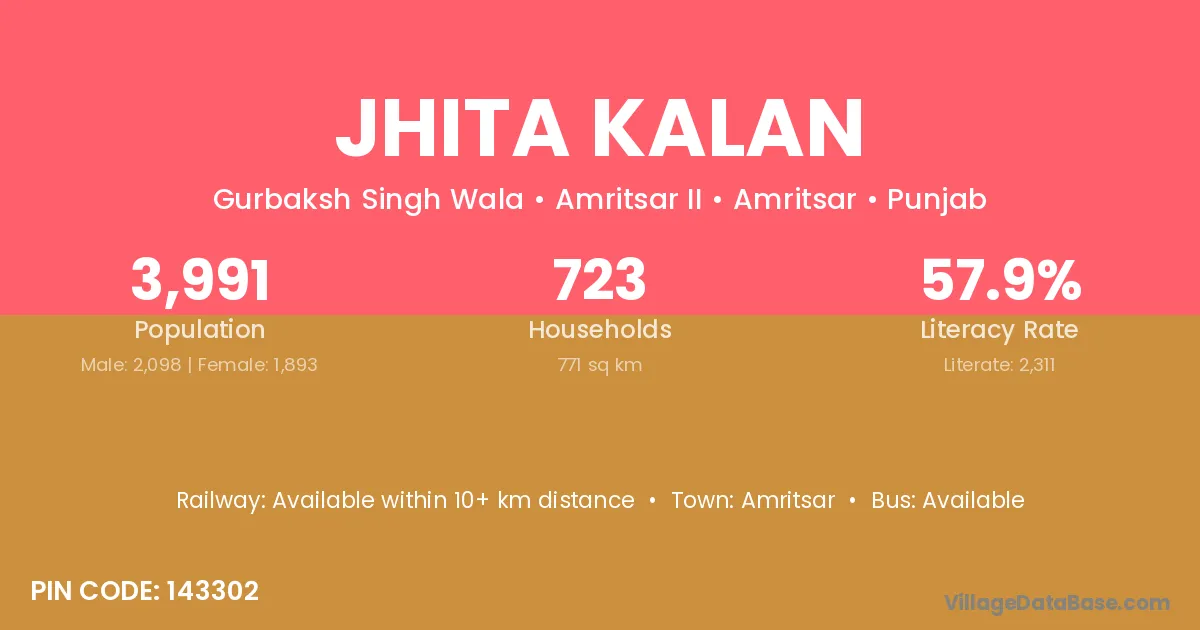 Jhita Kalan village has a total population of 3,991 people, of which 2,098 are males and 1,893 are females.