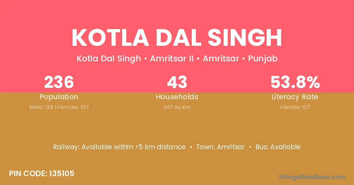 Kotla Dal Singh village has a total population of 236 people, of which 129 are males and 107 are females.