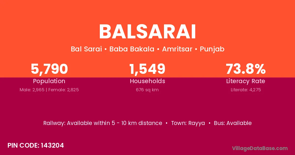 According to Census 2011 information, the village code of Balsarai village is 143204.
