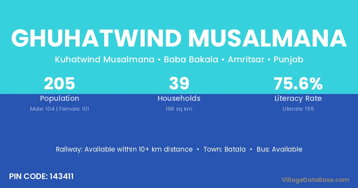 Ghuhatwind Musalmana village has a total population of 205 people, of which 104 are males and 101 are females.