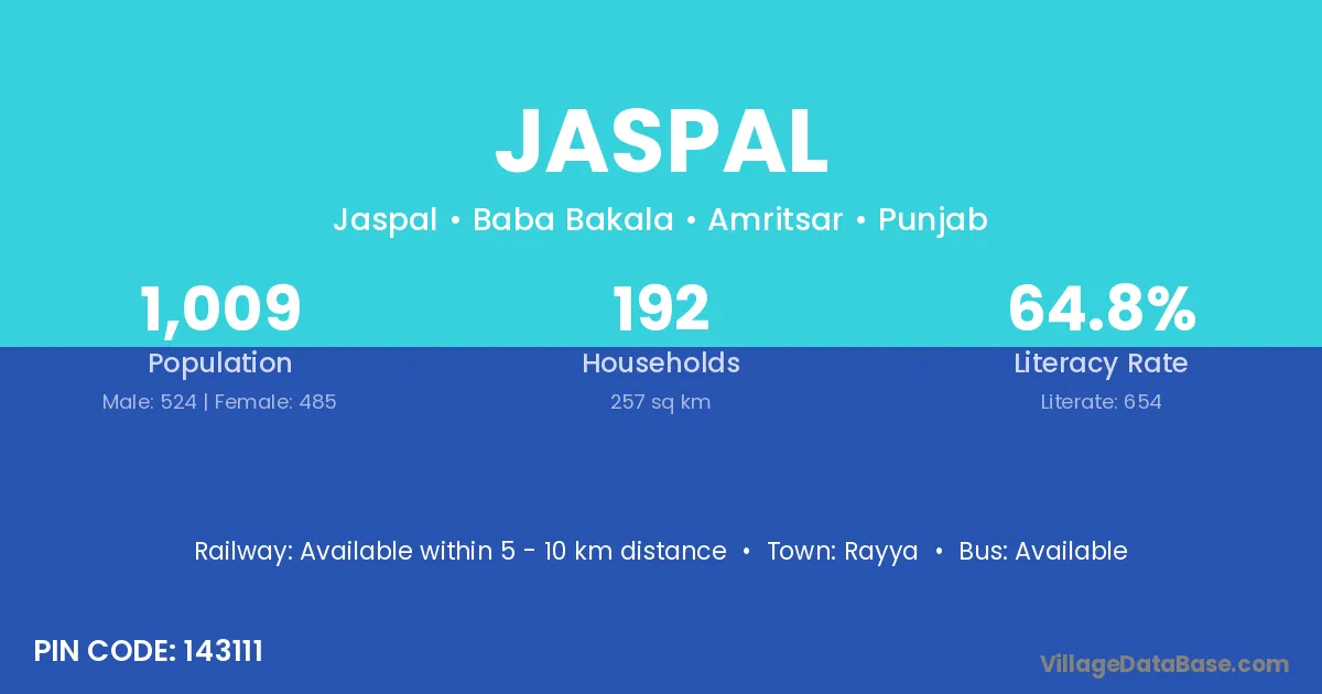 Jaspal village has a total population of 1,009 people, of which 524 are males and 485 are females.