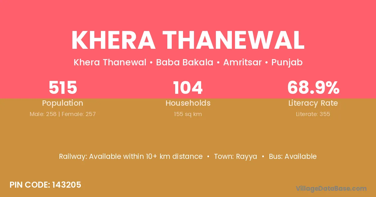 According to Census 2011 information, the village code of Khera Thanewal village is 143205.