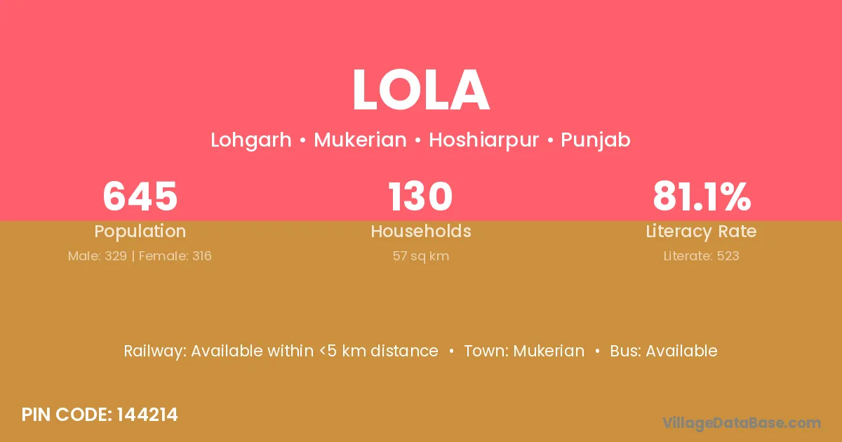 The literacy rate of Lola village is 59.38%. Male literacy stands at 61.82% and female literacy at 56.70%.