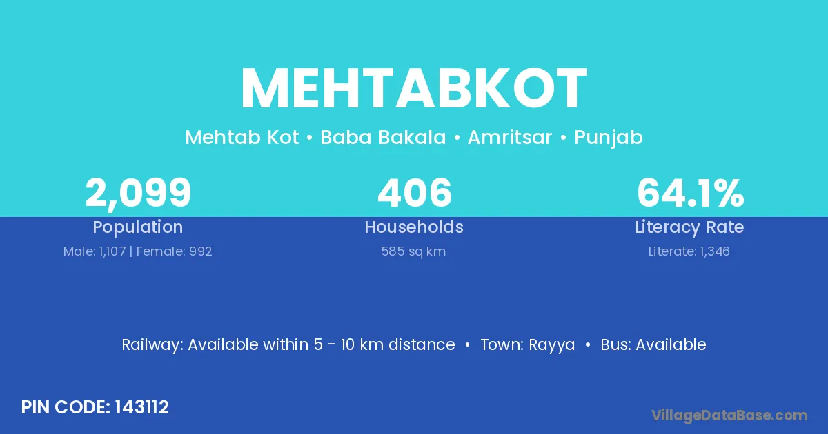 According to Census 2011 information, the village code of Mehtabkot village is 143112.