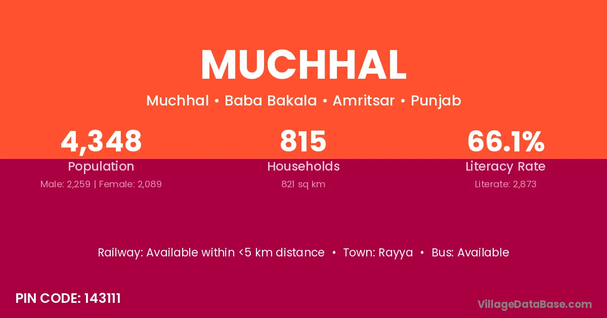 Muchhal village has a total population of 4,348 people, of which 2,259 are males and 2,089 are females.