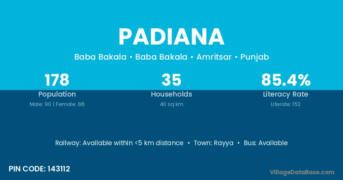 According to Census 2011 information, the village code of Padiana village is 143112.
