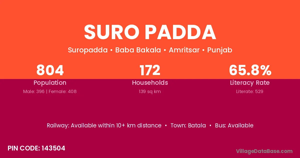 According to Census 2011 information, the village code of Suro Padda village is 143504.