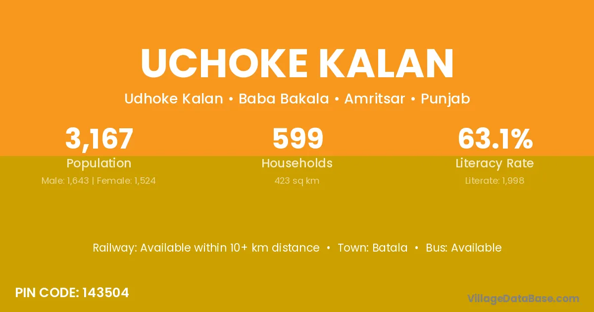 Uchoke Kalan village has a total population of 3,167 people, of which 1,643 are males and 1,524 are females.