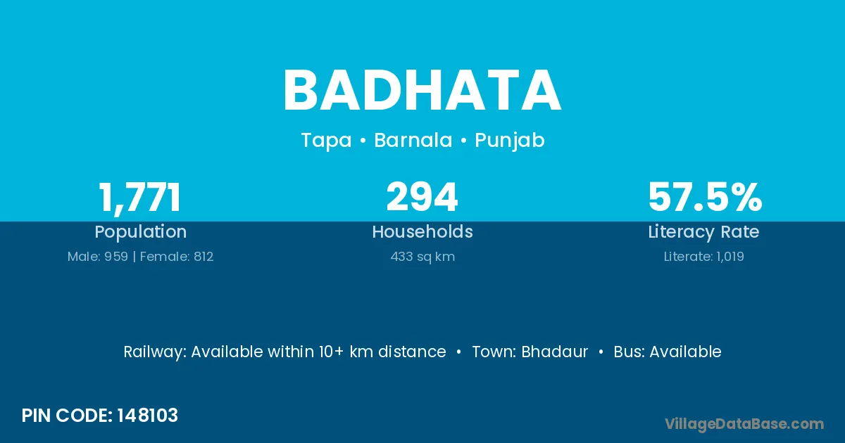 Bhadaur is the nearest town to Badhata village for major economic activities