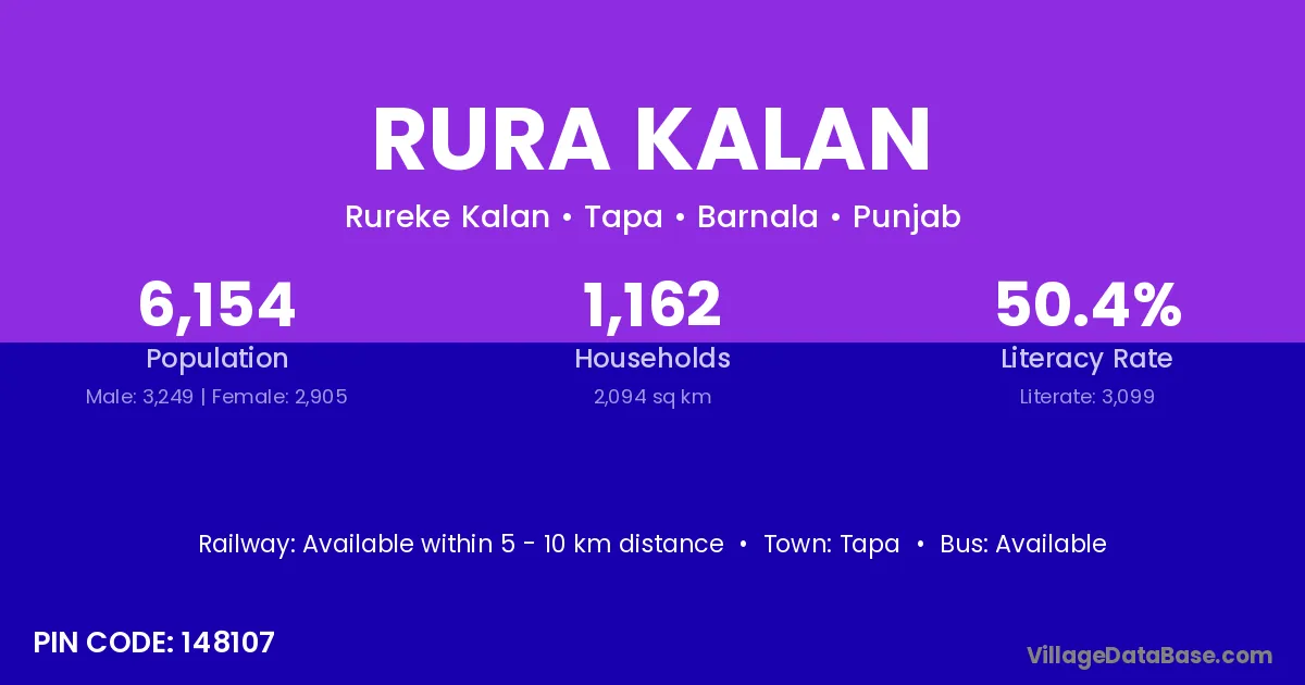 Rura Kalan village has a total population of 6,154 people, of which 3,249 are males and 2,905 are females.