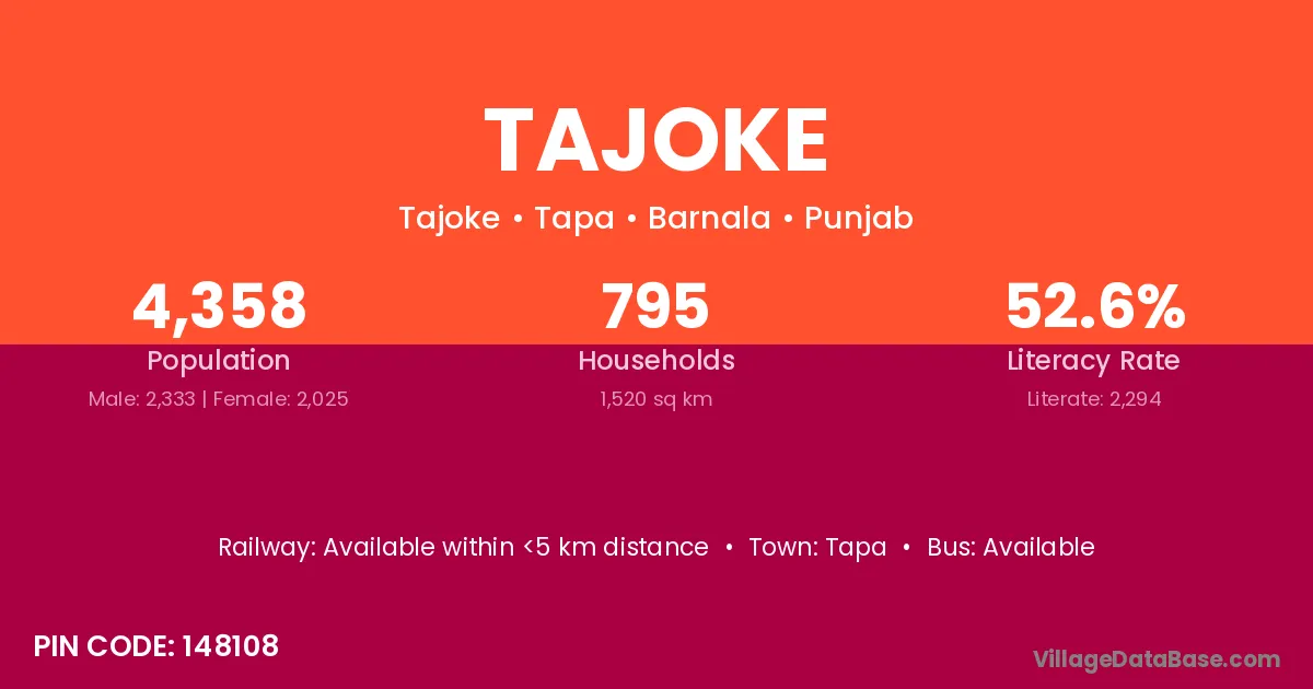 Tajoke village has a total population of 4,358 people, of which 2,333 are males and 2,025 are females.