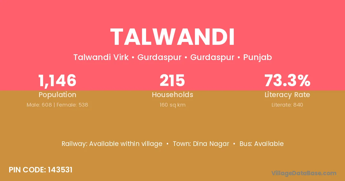 The literacy rate of Talwandi village is 58.17%. Male literacy stands at 60.79% and female literacy at 55.24%.