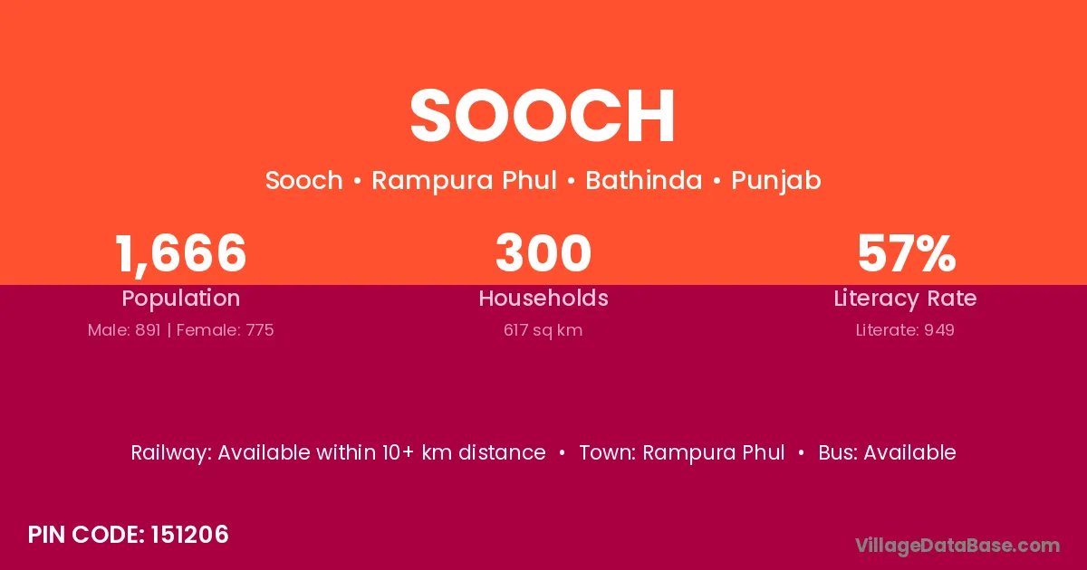 According to Census 2011 information, the village code of Sooch village is 151206.