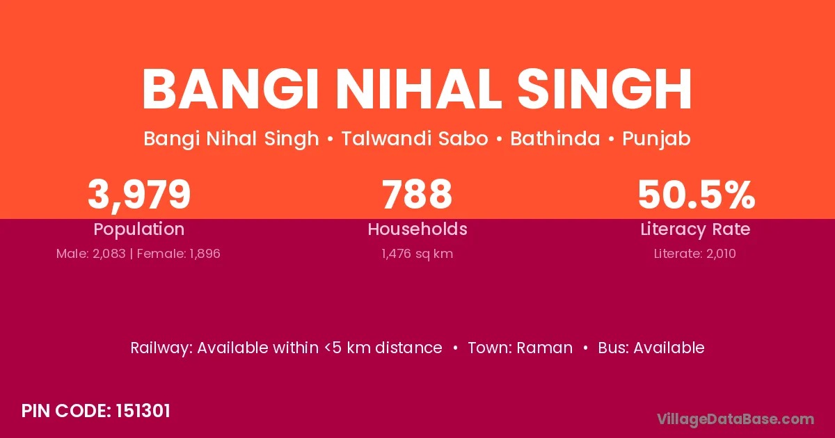 Bangi Nihal Singh village has a total population of 3,979 people, of which 2,083 are males and 1,896 are females.