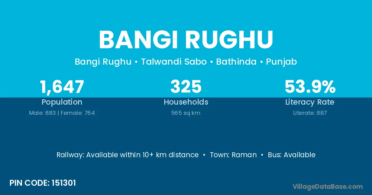 Bangi Rughu village is located in the Talwandi Sabo Tehsil of the Bathinda district in Punjab .