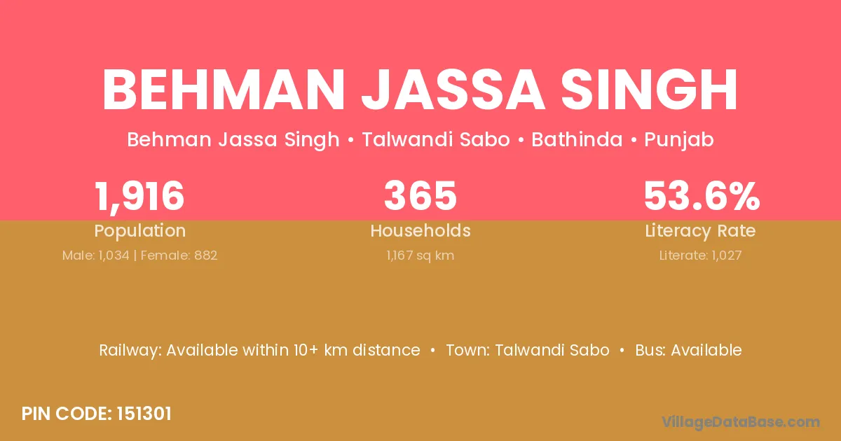 Behman Jassa Singh village has a total population of 1,916 people, of which 1,034 are males and 882 are females.