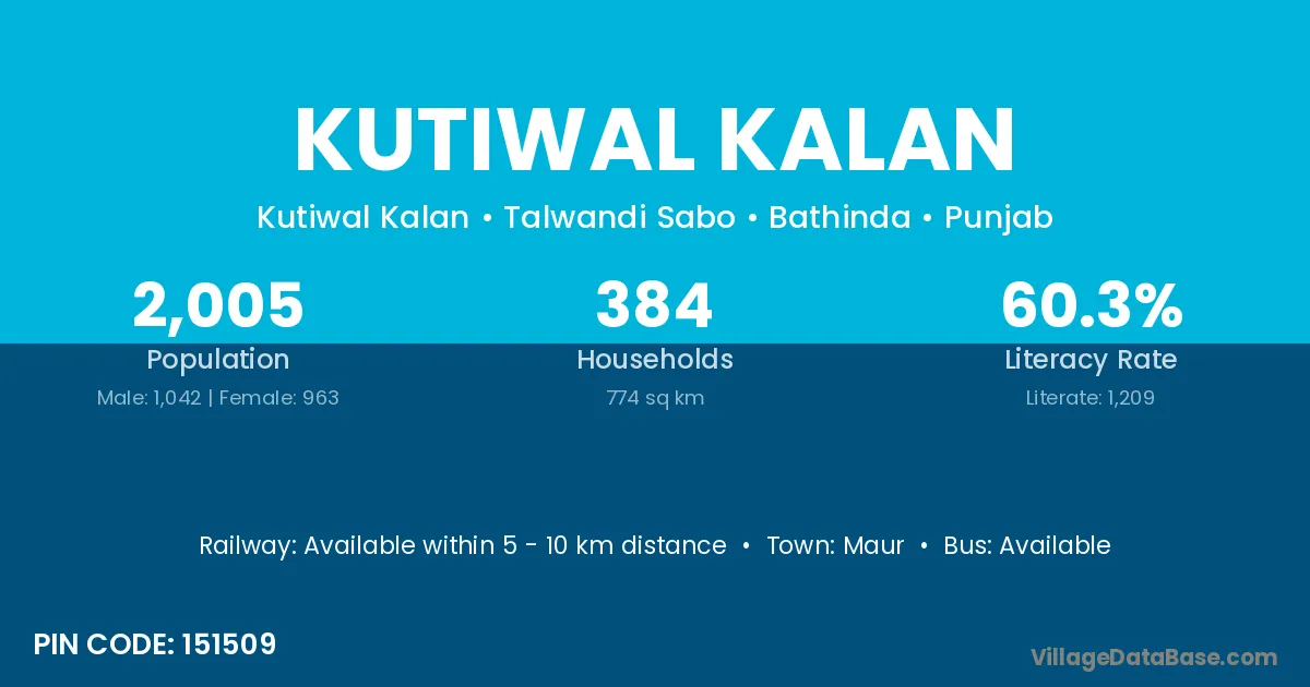 Kutiwal Kalan village has a total population of 2,005 people, of which 1,042 are males and 963 are females.