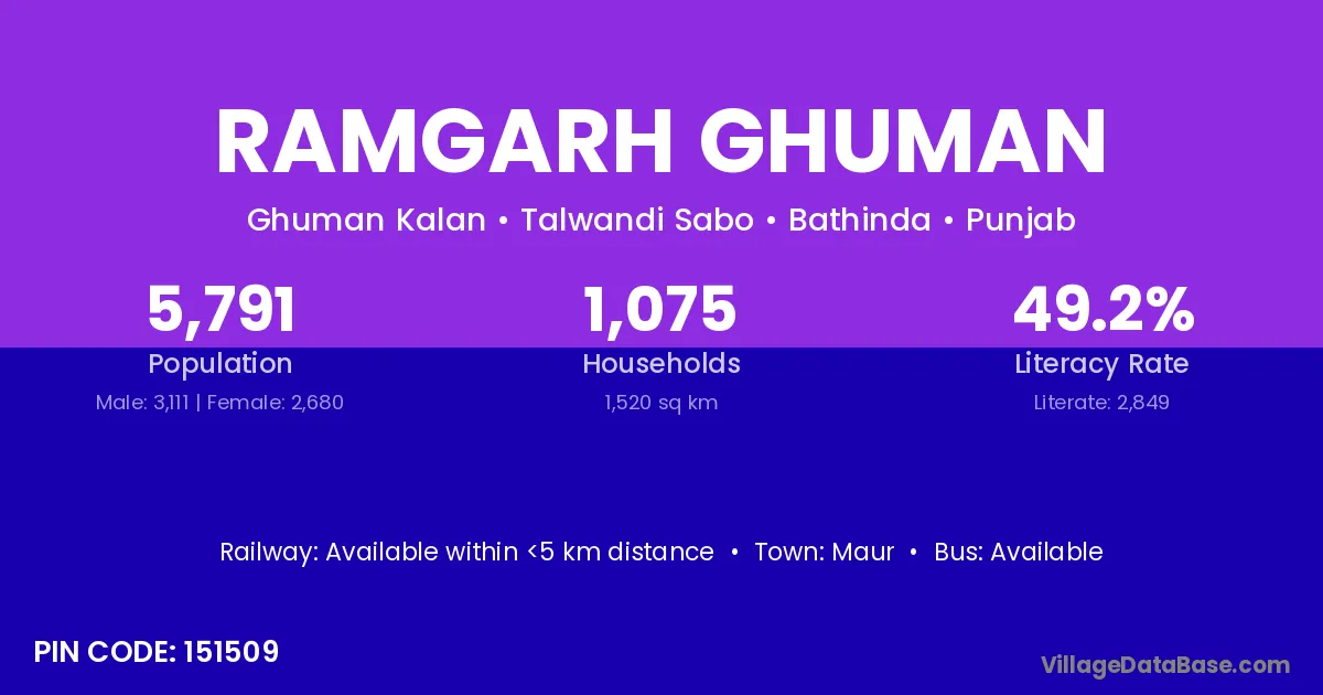 Ramgarh Ghuman village has a total population of 5,791 people, of which 3,111 are males and 2,680 are females.