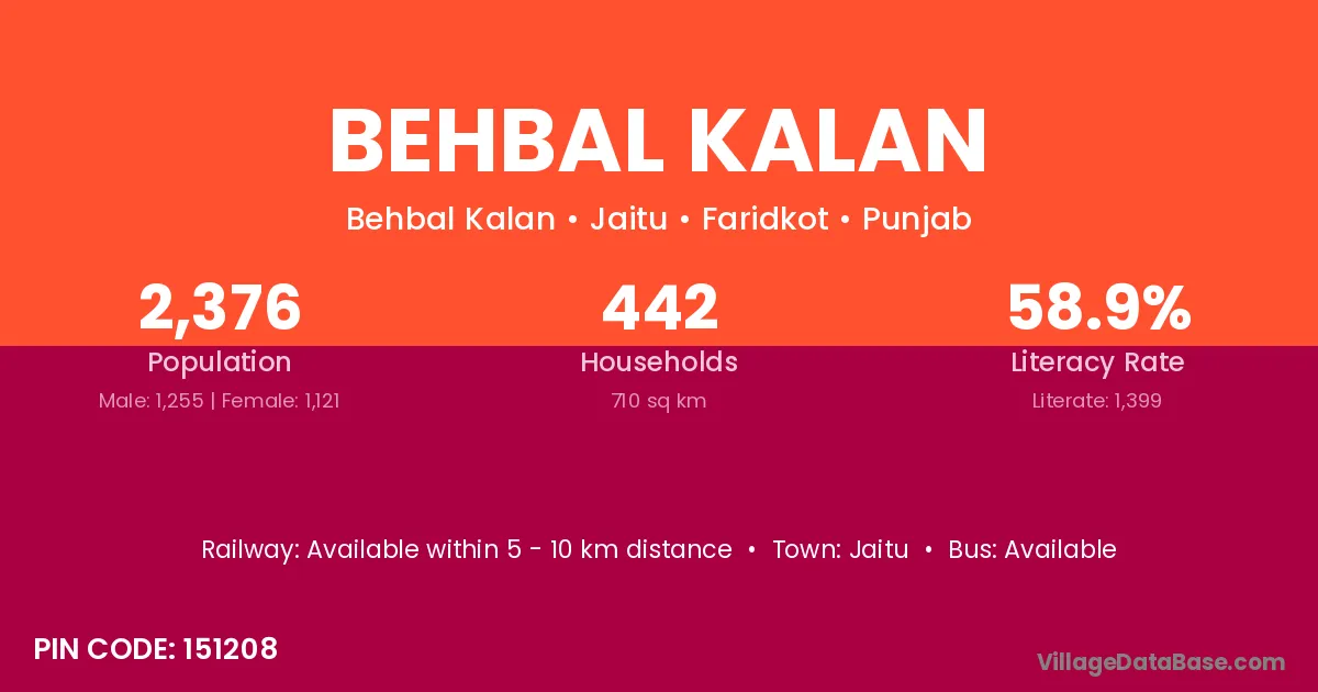 Behbal Kalan village has a total population of 2,376 people, of which 1,255 are males and 1,121 are females.
