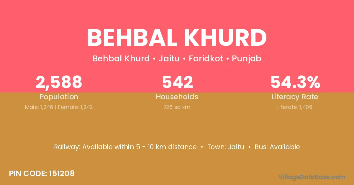 Behbal Khurd village has a total population of 2,588 people, of which 1,346 are males and 1,242 are females.