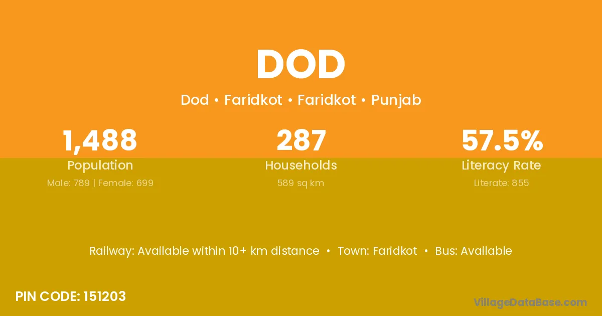 The literacy rate of Dod village is 59.50%. Male literacy stands at 66.90% and female literacy at 51.43%.