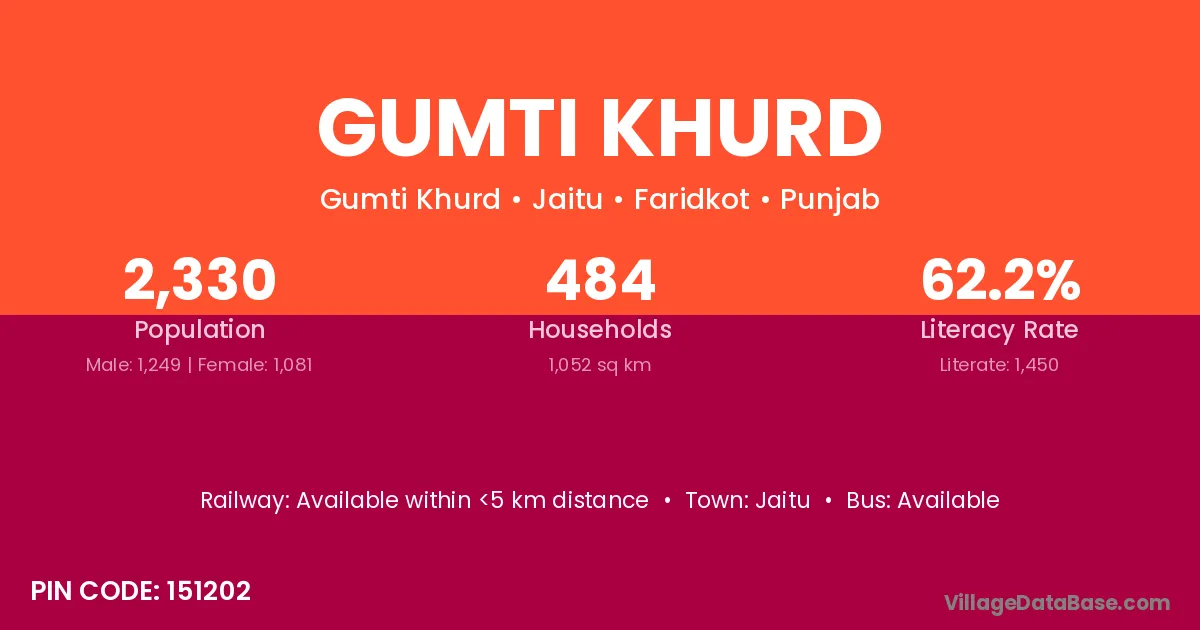 Gumti Khurd village has a total population of 2,330 people, of which 1,249 are males and 1,081 are females.