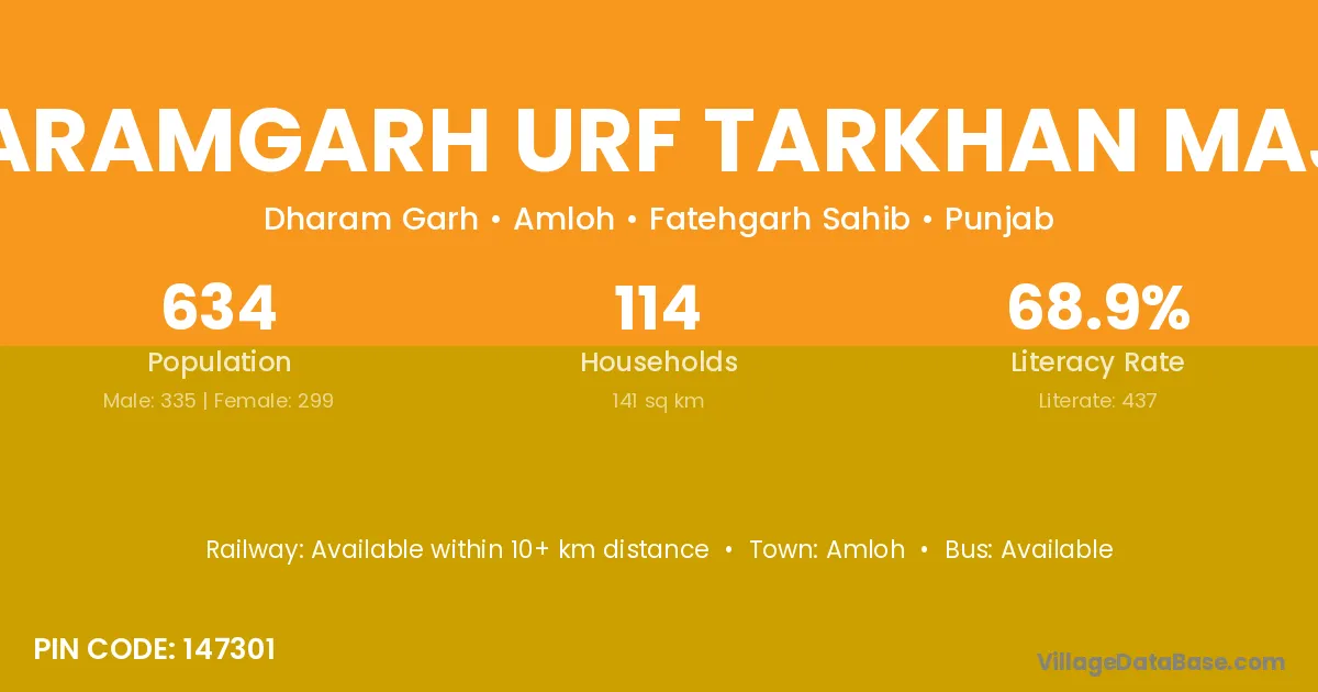Dharamgarh Urf Tarkhan Majra village has a total population of 634 people, of which 335 are males and 299 are females.
