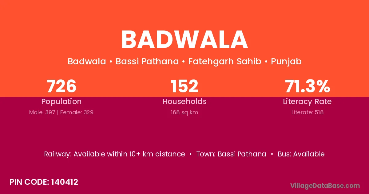 Badwala village has a total population of 726 people, of which 397 are males and 329 are females.