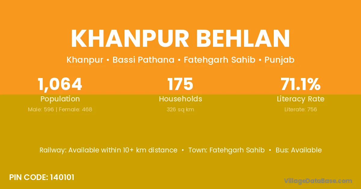 Khanpur Behlan village has a total population of 1,064 people, of which 596 are males and 468 are females.
