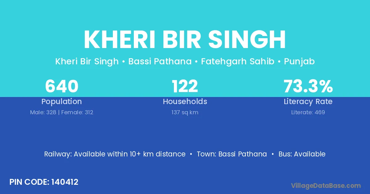 Kheri Bir Singh village has a total population of 640 people, of which 328 are males and 312 are females.