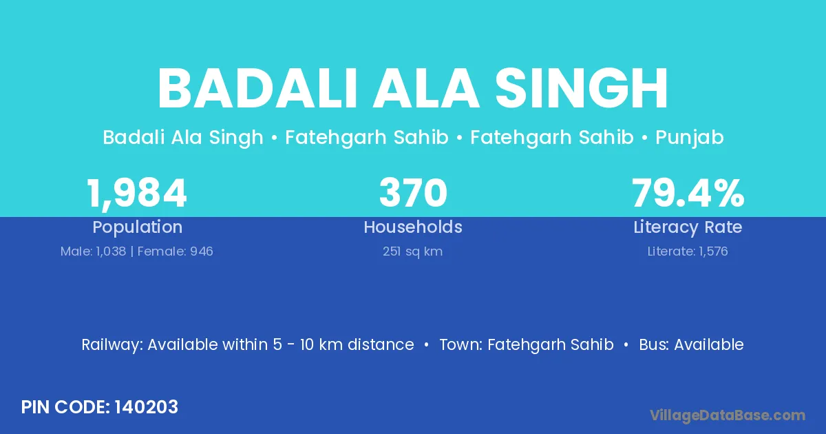 Badali Ala Singh village has a total population of 1,984 people, of which 1,038 are males and 946 are females.
