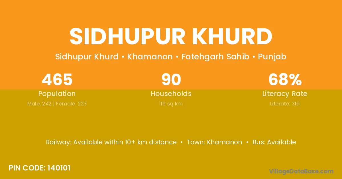 Sidhupur Khurd village has a total population of 465 people, of which 242 are males and 223 are females.