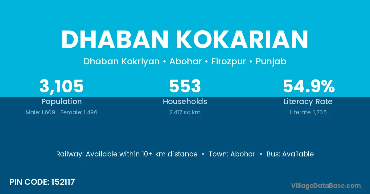 Abohar is the nearest town to Dhaban Kokarian village for major economic activities