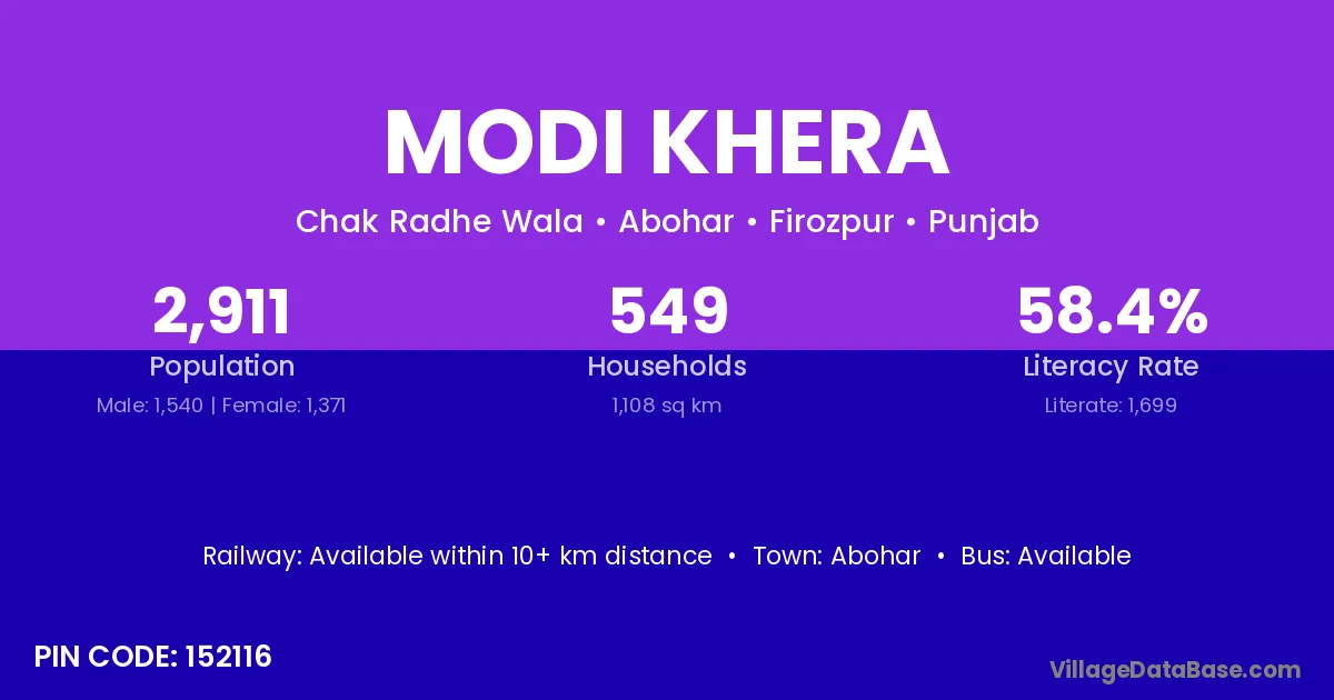 Abohar is the nearest town to Modi Khera village for major economic activities
