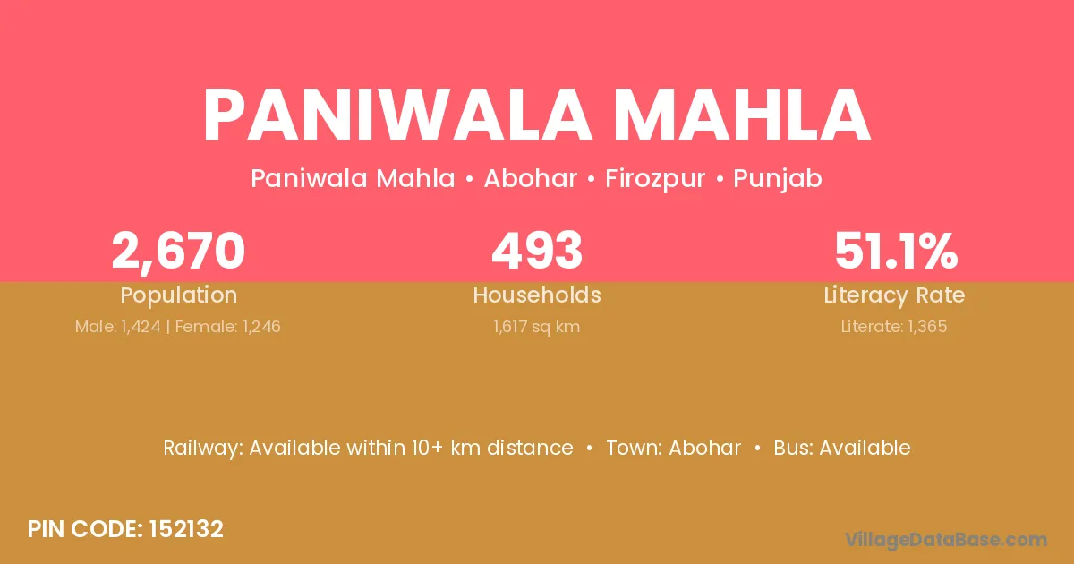 Paniwala Mahla village has a total population of 2,670 people, of which 1,424 are males and 1,246 are females.