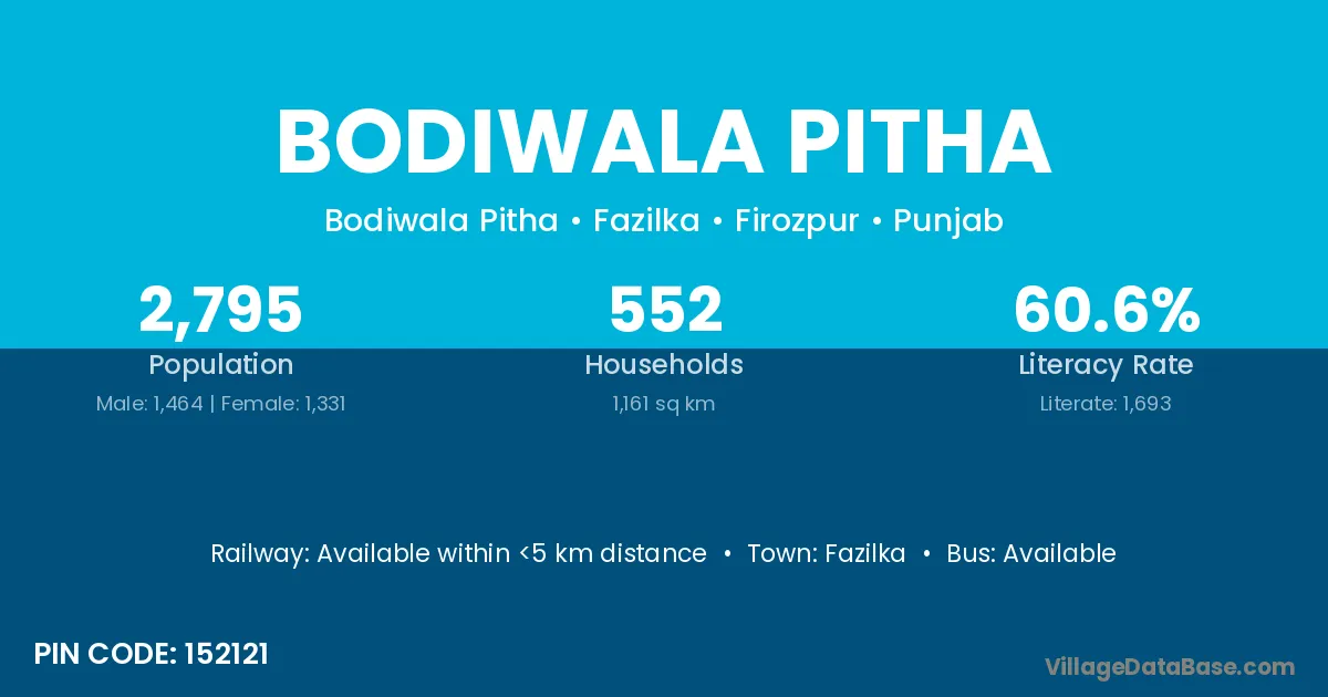 Fazilka is the nearest town to Bodiwala Pitha village for major economic activities