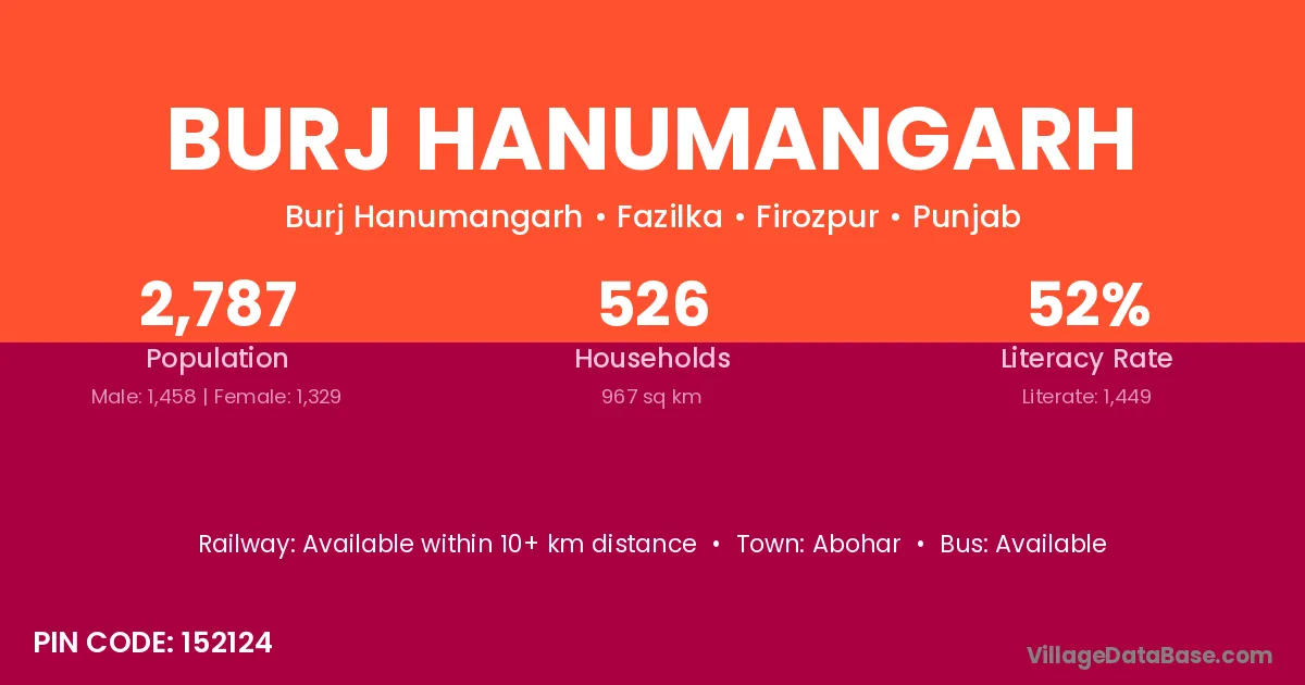 Abohar is the nearest town to Burj Hanumangarh village for major economic activities