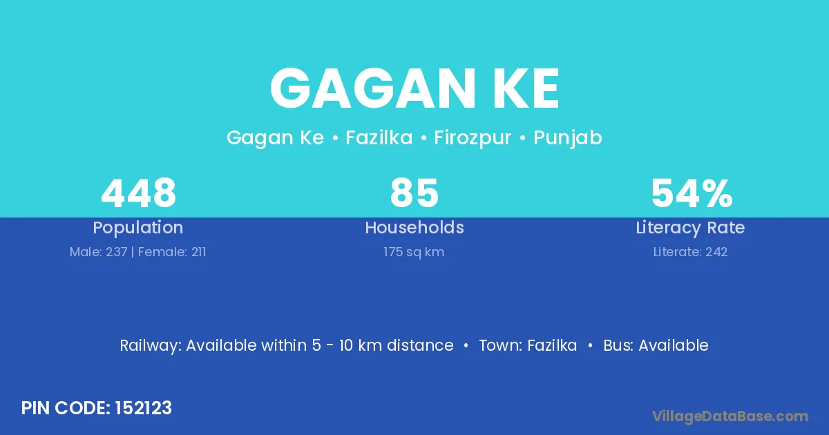 Gagan Ke village has a total population of 448 people, of which 237 are males and 211 are females.