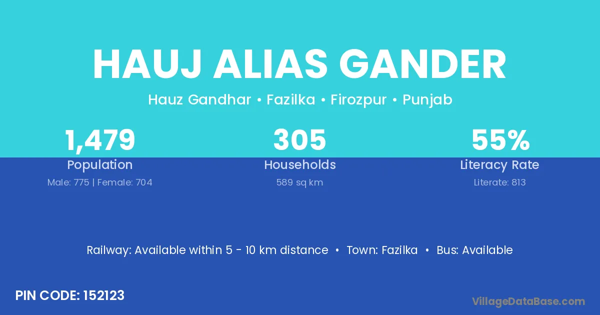 Hauj Alias Gander village has a total population of 1,479 people, of which 775 are males and 704 are females.
