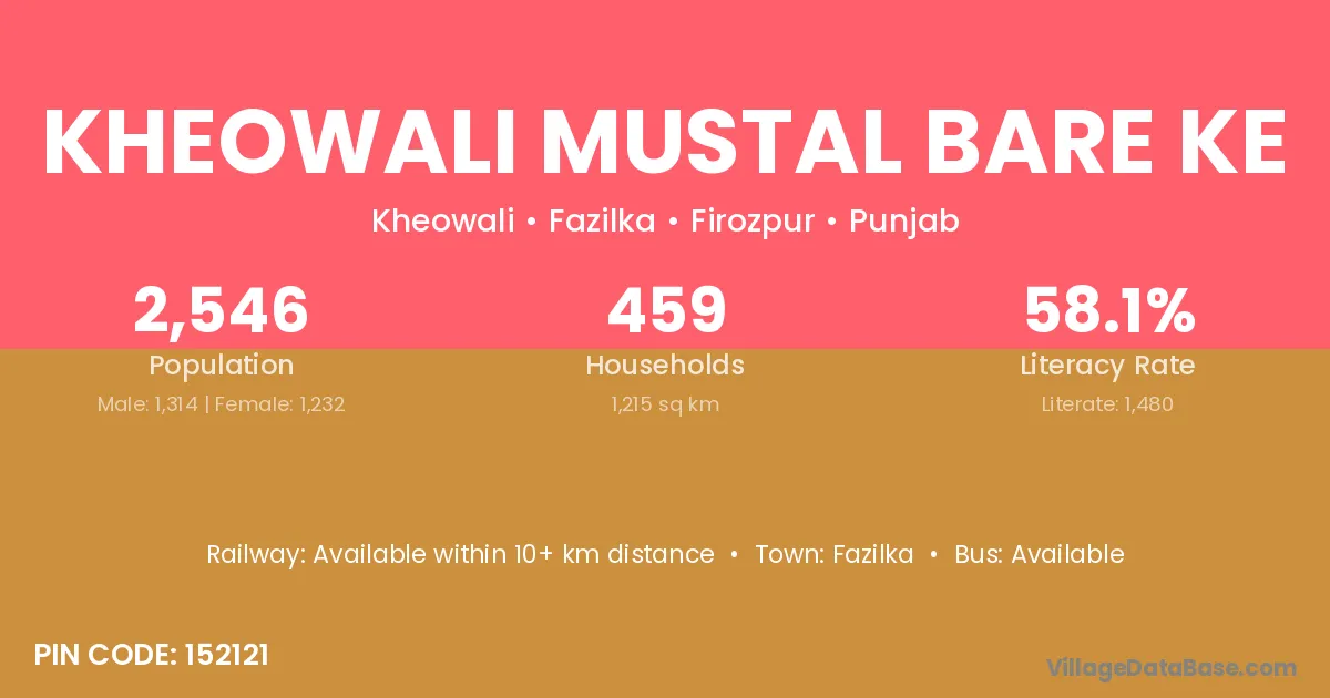Kheowali Mustal Bare Ke village has a total population of 2,546 people, of which 1,314 are males and 1,232 are females.