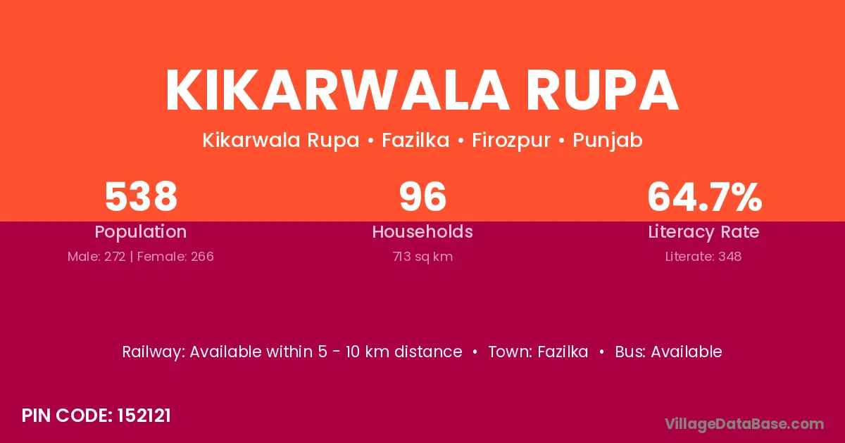 Kikarwala Rupa village has a total population of 538 people, of which 272 are males and 266 are females.