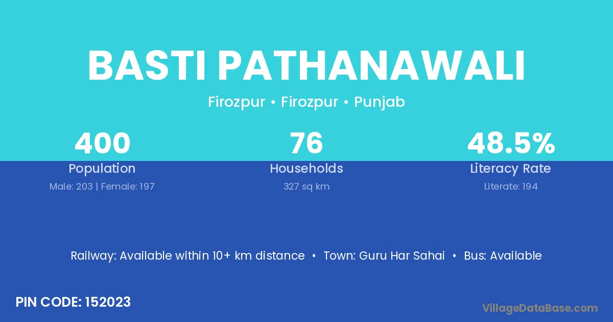 Guru Har Sahai is the nearest town to Basti Pathanawali village for major economic activities