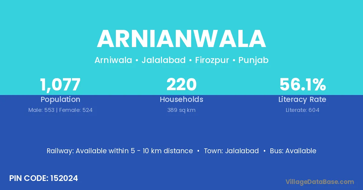 Arnianwala village has a total population of 1,077 people, of which 553 are males and 524 are females.