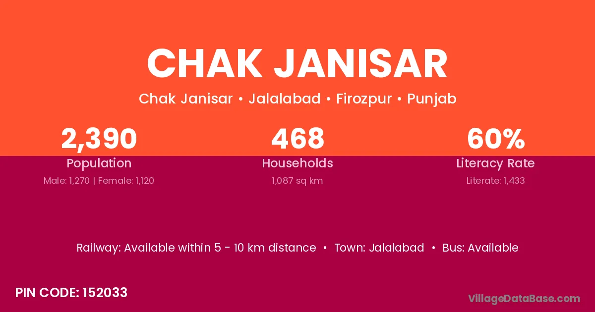 Chak Janisar village has a total population of 2,390 people, of which 1,270 are males and 1,120 are females.
