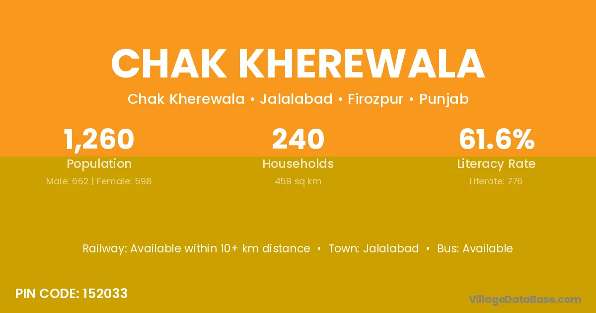 Chak Kherewala village has a total population of 1,260 people, of which 662 are males and 598 are females.