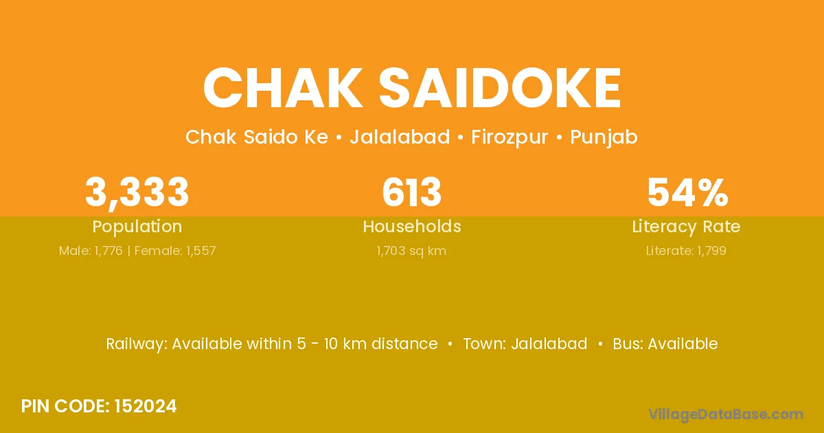 Chak Saidoke village has a total population of 3,333 people, of which 1,776 are males and 1,557 are females.