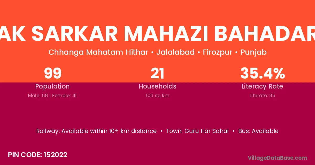 Chak Sarkar Mahazi Bahadar Ke village has a total population of 99 people, of which 58 are males and 41 are females.