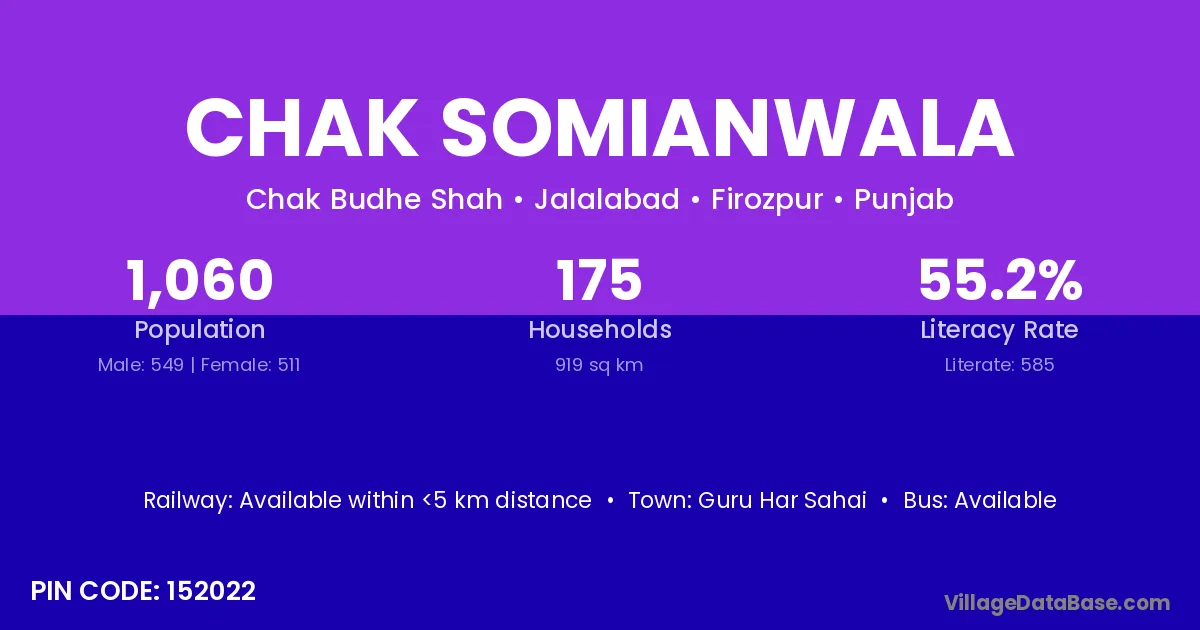 Guru Har Sahai is the nearest town to Chak Somianwala village for major economic activities